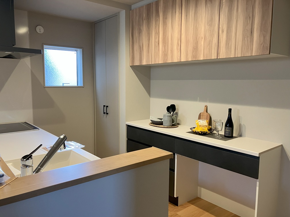 造り付けのカップボードと吊戸棚。半分はオープンになっていますので、以外と置き場所が定まらないゴミ箱を置くスペースとしても便利です。