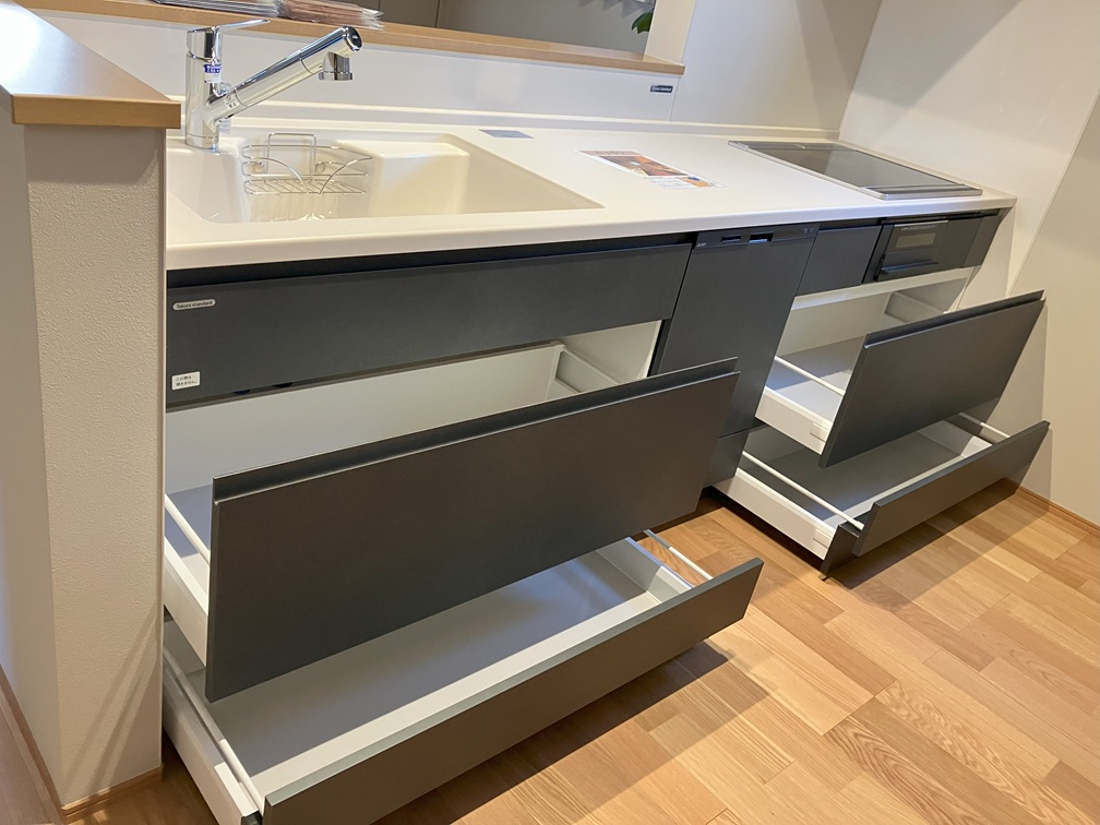 引き出し式収納は上から一目で見渡せるので探し物がすぐ見つけられますね♪ソフトクローズ機能でゆっくり閉まるので安全性も高いですね。