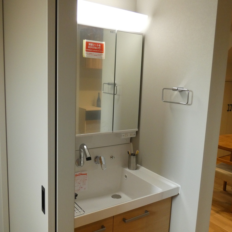 バケツの水くみもしやすい広々ボウル、お掃除しやすい水栓金具など、こちらも工夫いっぱいのリクシル製。ミラーの後ろは収納になっているのでスッキリをいつも保てます(*^^*)